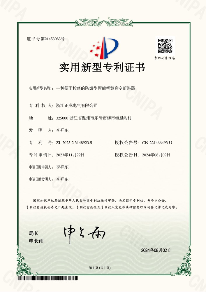202422692一种便于检修的防爆型智能智慧真空断路器2023231489235实用新型专利证书了解详情 -