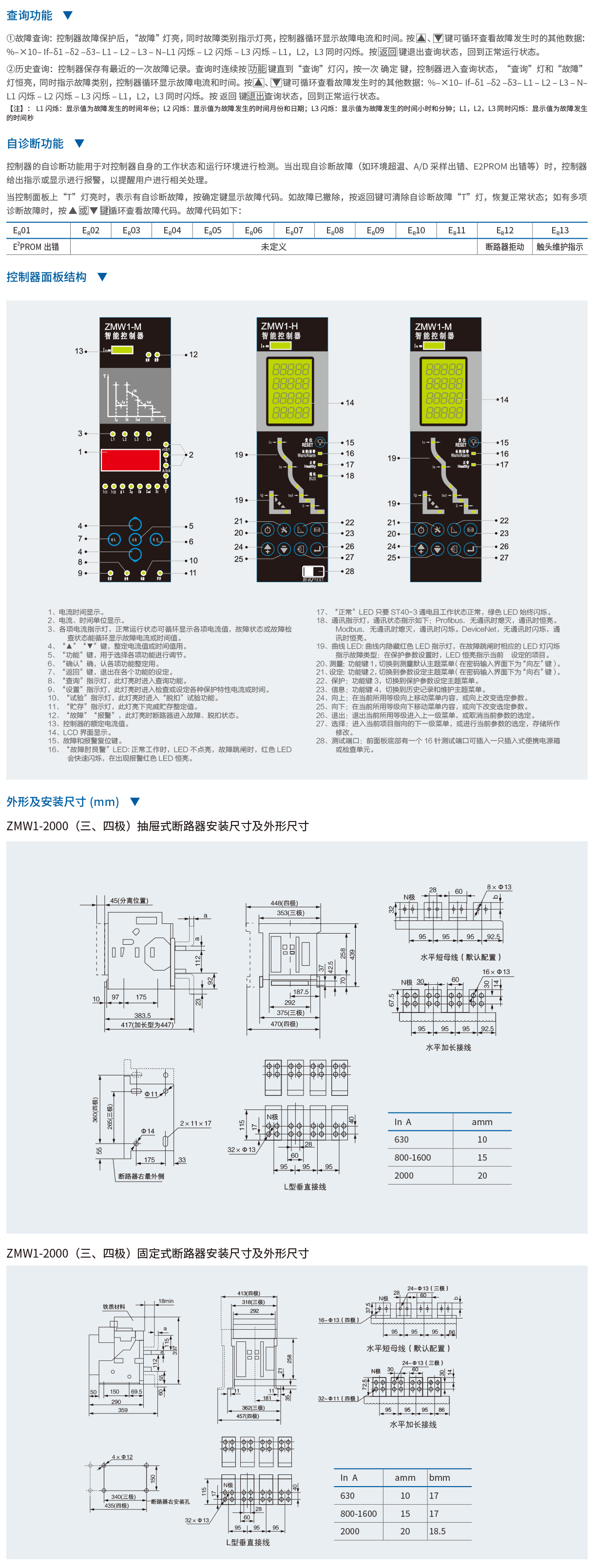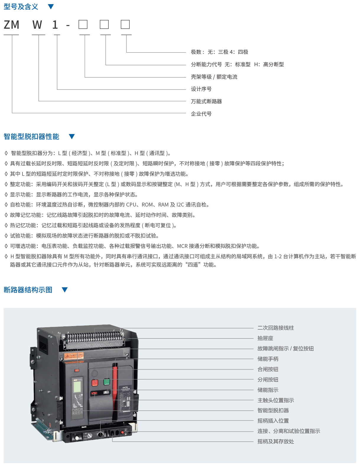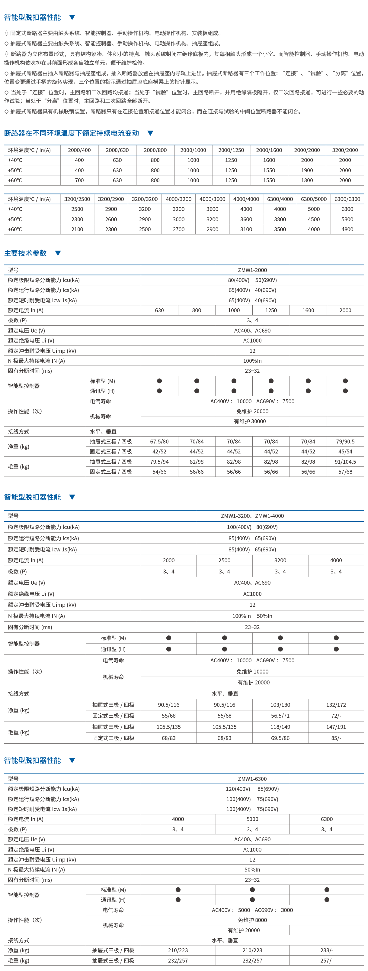 ZMW1-2000系列万能式断路器(以下简称断路器),适用于交流50Hz,额定工作电压至690V及以下,额定电流200A-6300A的配电网络中,用来分配电能和保护线路及电源设备免受过载、欠电压、短路、单相接地等故障的危害,断路器具有智能化保护功能,有较高精度的选择性保护,提高了供电可靠性。同时带有标准的RS485通讯接口,可进行“遥测”、“遥讯”、“遥控”、“遥调”四遥功能,以满足控制中心和自动化系统的要求。
