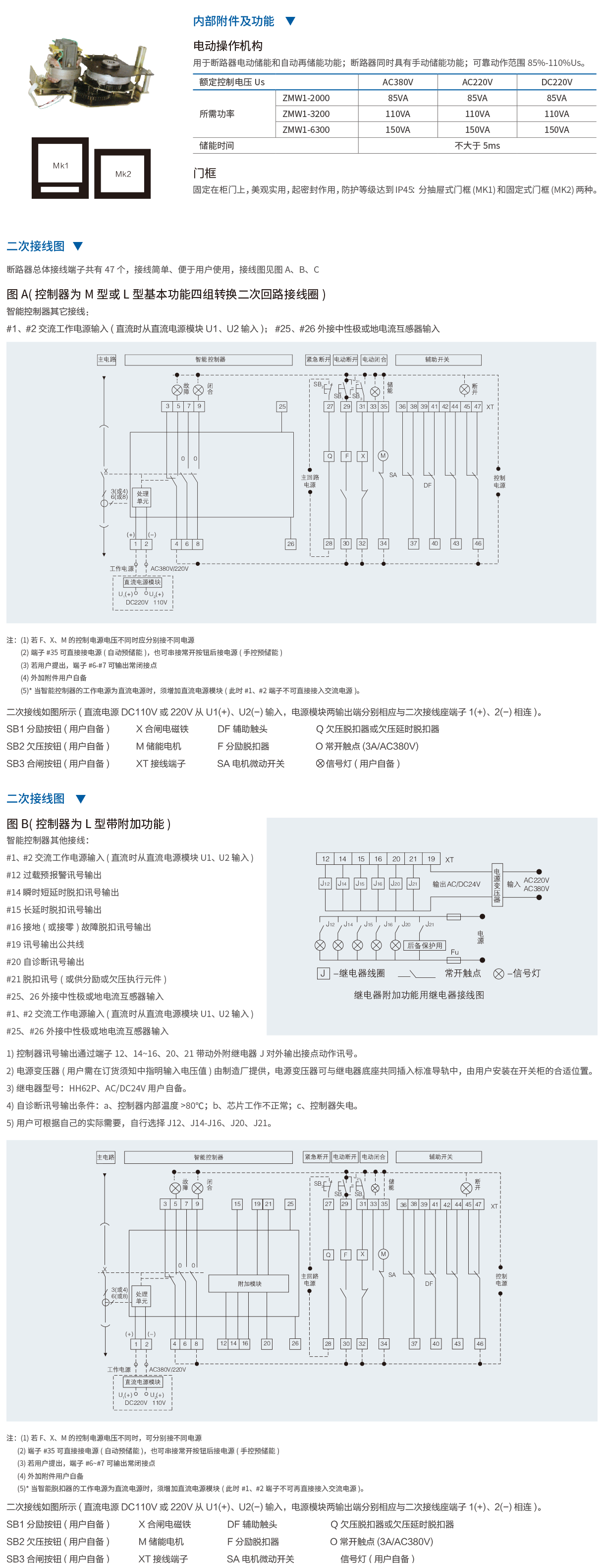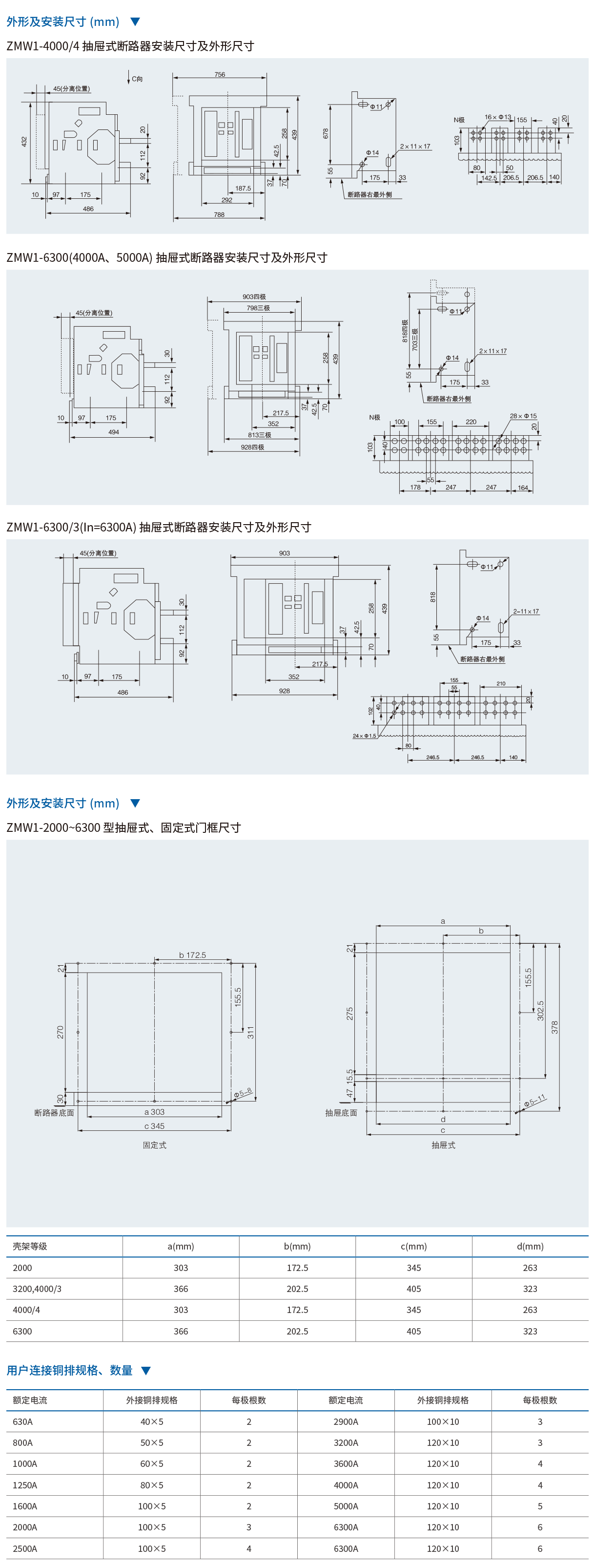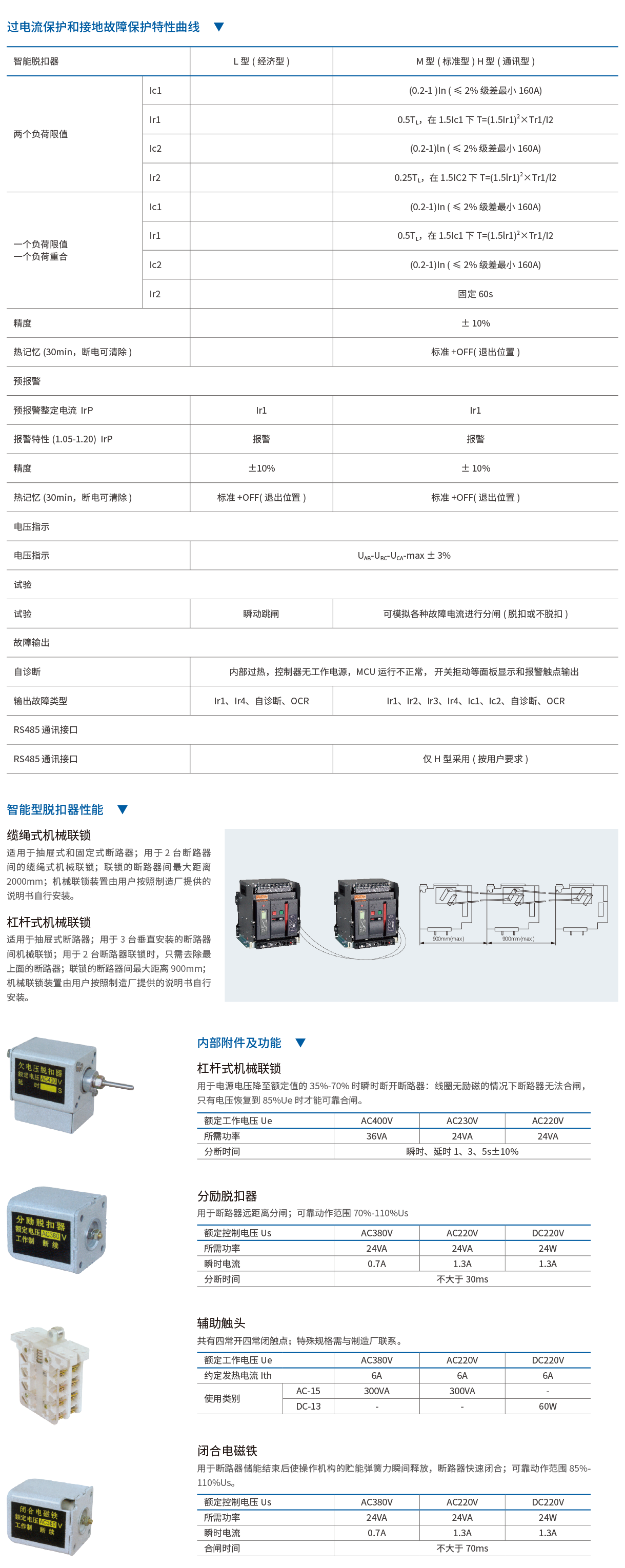 ZMW1-2000系列万能式断路器(以下简称断路器),适用于交流50Hz,额定工作电压至690V及以下,额定电流200A-6300A的配电网络中,用来分配电能和保护线路及电源设备免受过载、欠电压、短路、单相接地等故障的危害,断路器具有智能化保护功能,有较高精度的选择性保护,提高了供电可靠性。同时带有标准的RS485通讯接口,可进行“遥测”、“遥讯”、“遥控”、“遥调”四遥功能,以满足控制中心和自动化系统的要求。
