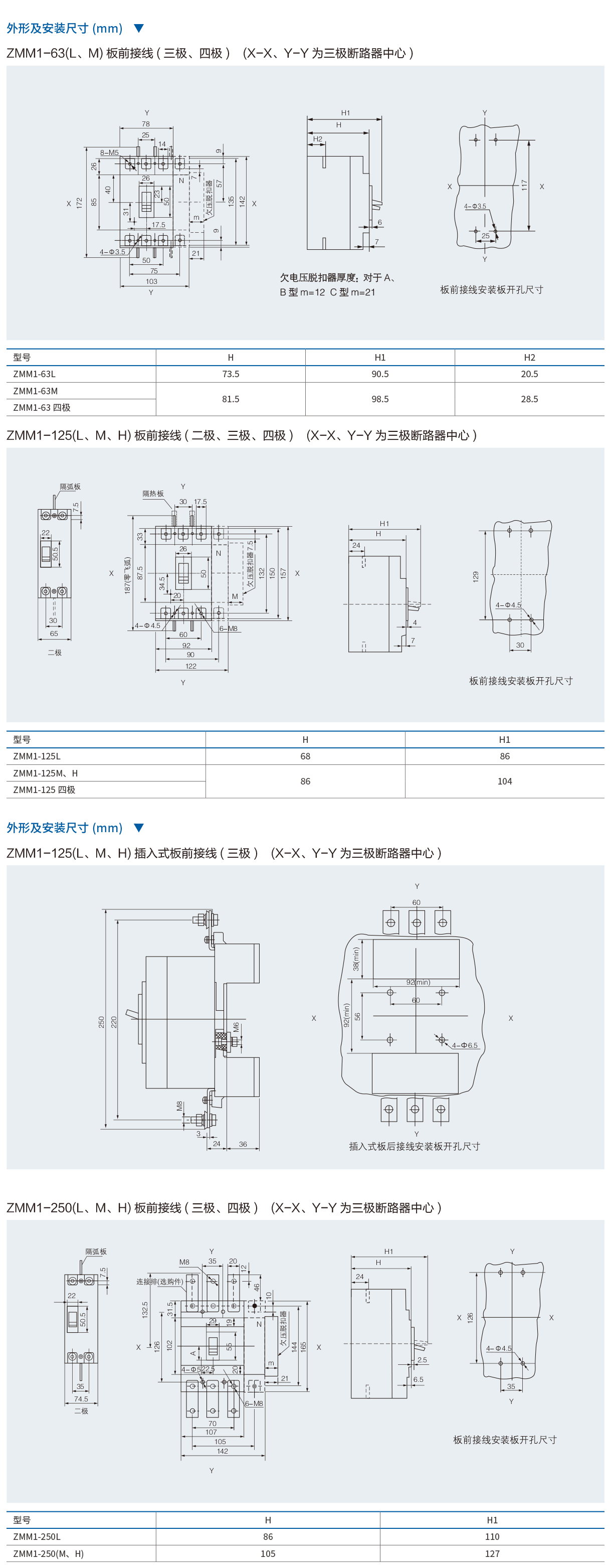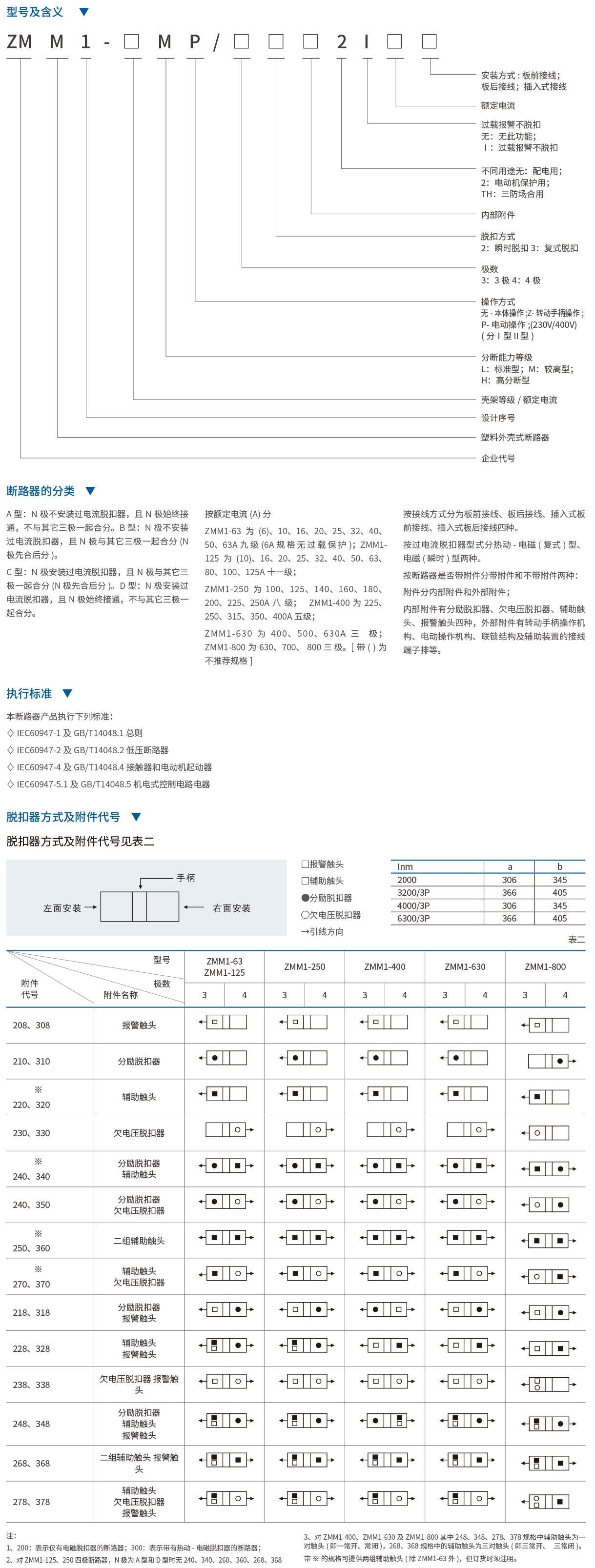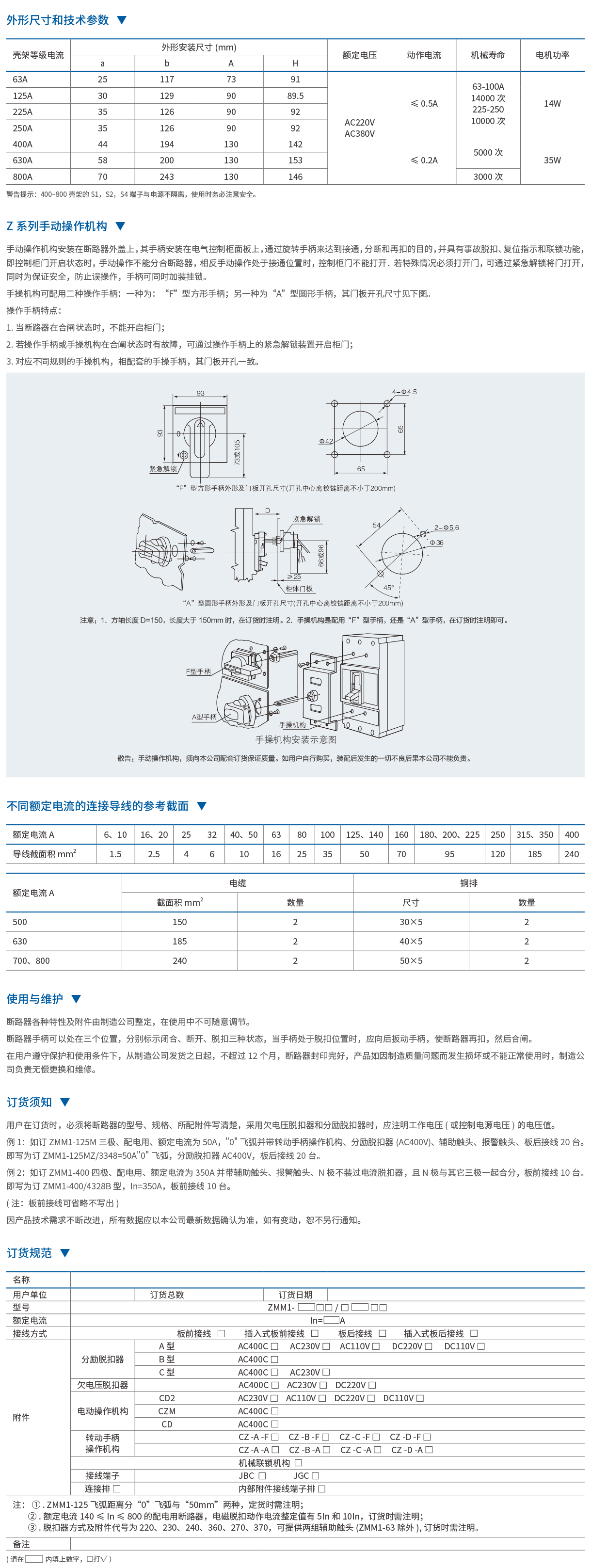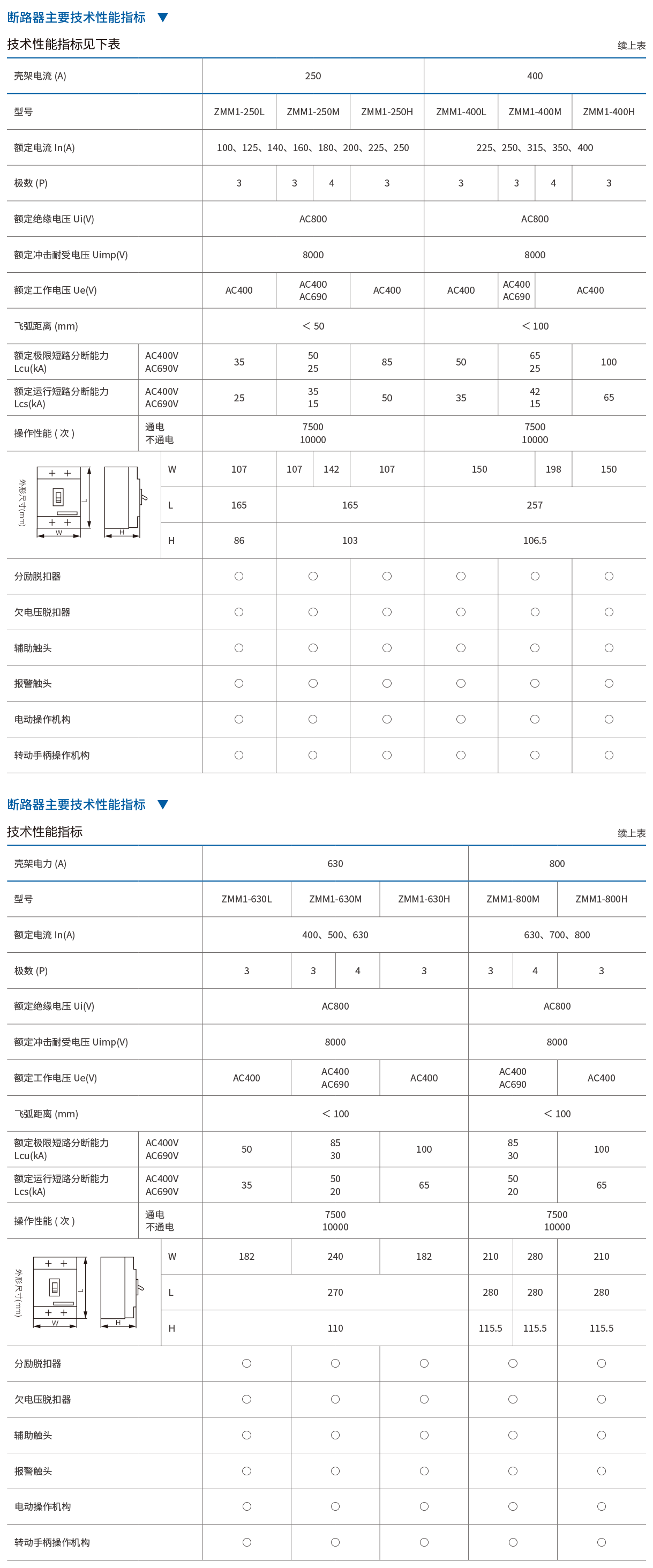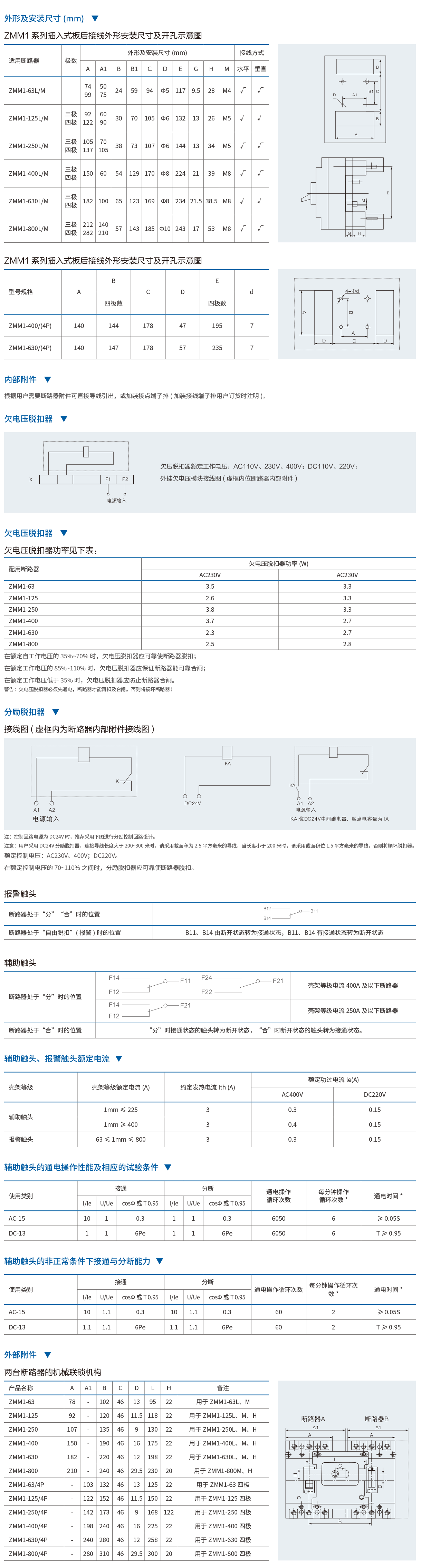 ZMM1系列塑料外壳式断路器(以下简称断路器),是本公司采用成熟的设计、制造技术研制、 开发的新型断路器之一。其额定绝缘电压为800V,适用于交流50Hz,额定工作电压690V及以下,(ZMM1-63为400V),额定工作电流至800A的电路中作不频繁转换及电动机不频繁起动之用。断路器具有过载、短路和欠电压保护功能,能保护线路和电源设备不受损坏。